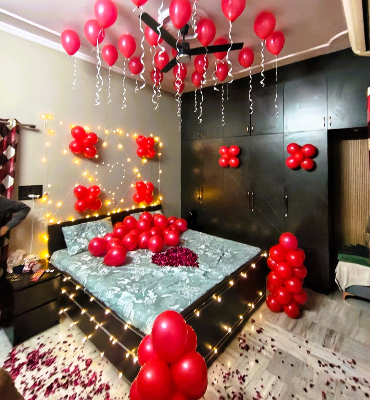 Create an unforgettable romantic experience with our Romantic Red Balloon Love Room Decoration in Jaipur. This beautifully designed setup features floating red ceiling balloons with elegant ribbons, warm fairy lights arranged in a geometric wall pattern, and heart-inspired balloon clusters that enhance the romantic mood. The bed is styled with premium balloons, rose petals, and soft lighting, while LED string lights outline the bed frame for a cozy and intimate ambience.