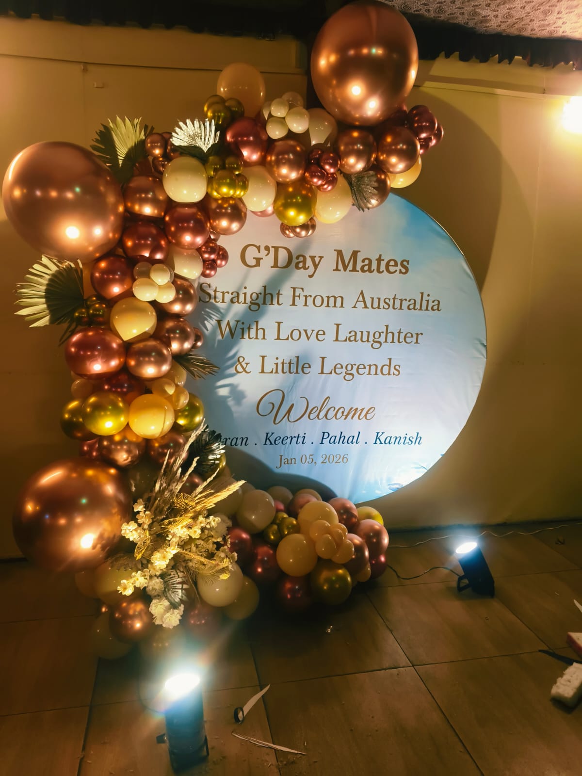 A beautiful welcome is the beginning of a memorable celebration. Our Luxury Metallic Welcome Balloon Decoration in Jaipur is designed to create an elegant and inviting atmosphere for your special moments. This décor features a carefully curated mix of metallic balloons in rose gold, copper, ivory, and gold shades, styled in an organic arch with a customized round backdrop.
